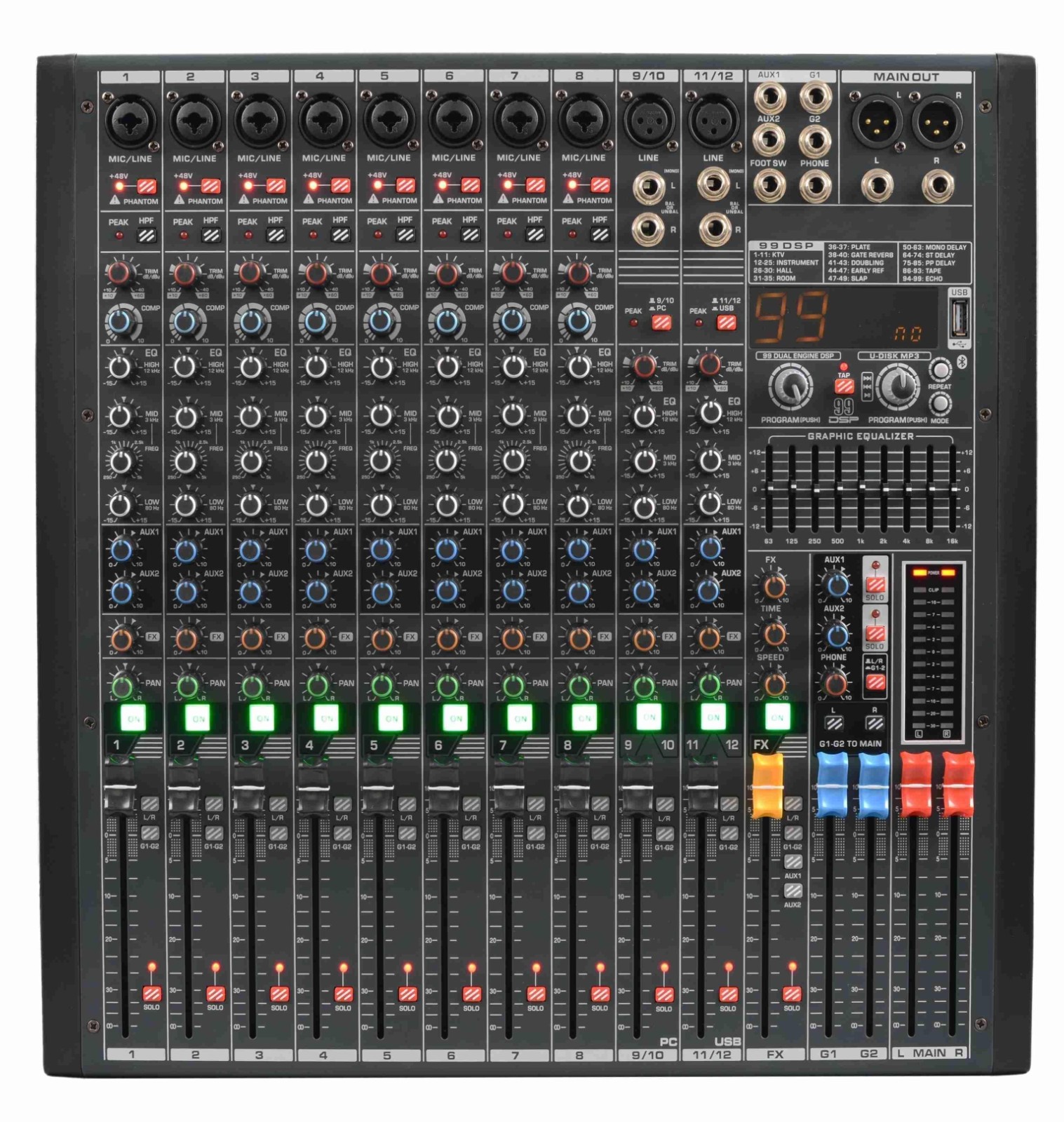 1.USB音频接口 *高解析192KHz 24位 *2进2出通道设计 2.内置99种效果器,内有11种专业KTV效果,每种效果参数都可调 3.2路AUX辅助输出 4.带48V幻象电源,每分路设有48V独立开关 5.每路监听按键带LED灯显示 6.每分路设有独立静音并且带LED双色显示 7.100mm行程推子控制 8.带蓝牙和MP3录音功能的播放器 9.每分路带有低音衰减功能 10.立体声输出加2路编组输出 11.全系列2路立体声输入 12.每分路均衡带中音扫频功能
