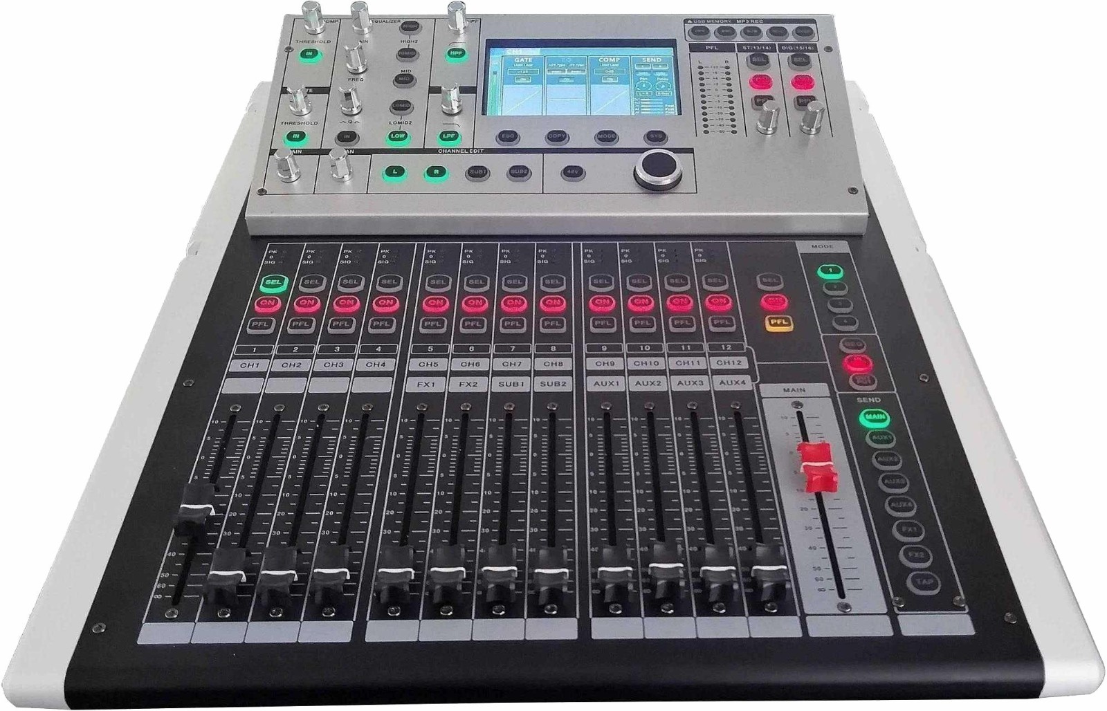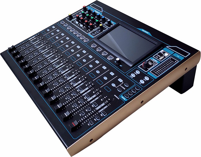 20路信号输入(12MIC数字增益调节、2组立体声、1组返回、声卡/MP3+光纤),内置压限器,高低通,4段参数均衡,延时,声像平衡调节,10路信号输出(LR主输出,6编组输出,2辅助输出),两路独立效果器,13个100MM电动推子,内置声卡,4个快捷场景模式调用键,脚踏开关接口,光纤输入/输出,多轨数字录音。7寸触摸屏,支持有线网口调节(或外接路由器无线调节)