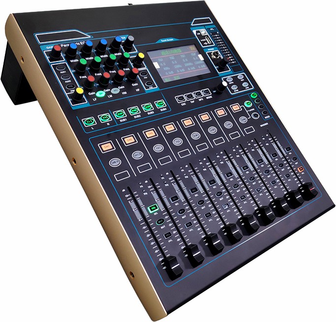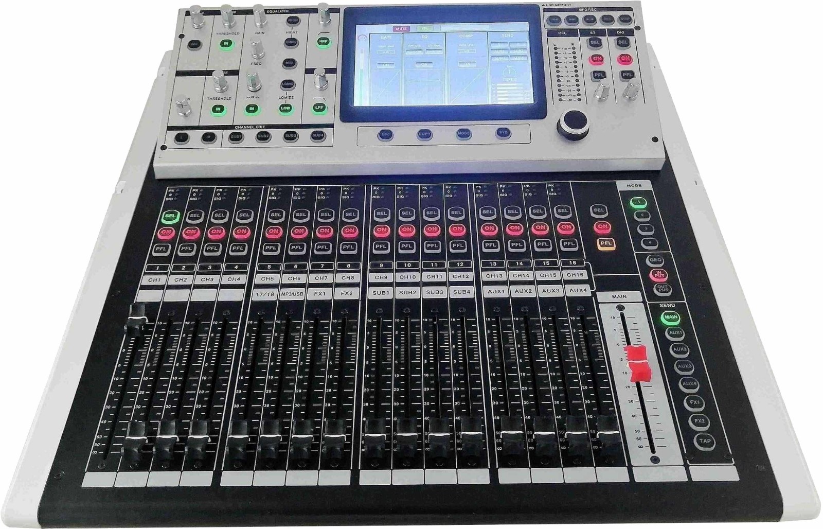 16路信号输入(8MIC数字增益调节、2组立体声、1组返回、声卡/MP3+光纤),内置压限器,高低通,4段参数均衡,延时,声像平衡调节,8路信号输出(LR主输出,4编组输出,2辅助输出),两路独立效果器,9个100MM电动推子,内置声卡,4个快捷场景模式调用键,脚踏开关接口,光纤输入/输出,多轨数字录音。4.3寸触摸屏,支持有线网口调节(或外接路由器无线调节)