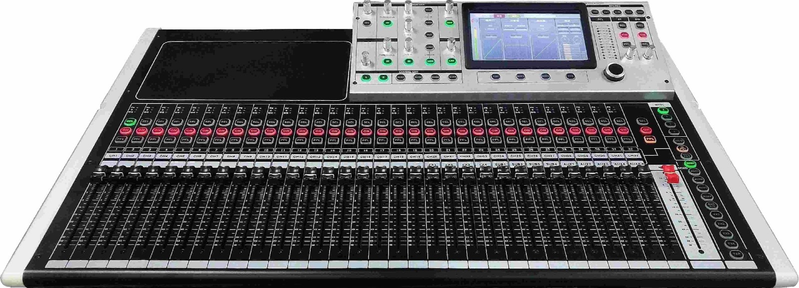24路信号输入(24路MIC输入1组立体声输入),内置压限器,高低通,5段参数均衡,延时,声像平衡调节,12路信号输出(主输出L,R,6路AUX输出,4路编组输出),四路独立效果器,25个100MM电动推子,内置声卡,4个快捷场景模式调用键,100个场景模式储存,脚踏开关接口,光纤输入/输出,立体声数字录音。7寸触摸屏,支持无线网口调节(或无线路由器无线调节)机器尺寸 637*515*215